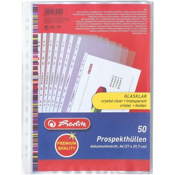 HERLITZ – Pochettes perforées – A4 – Lisses – 0,09 mm – Par 50