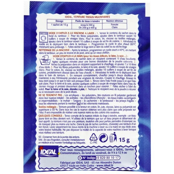 Contrairement aux autres teinture Idéal, plus sélectives, la teinture Multifibres permet de colorer les polyamides, la laine, la soie, le jute, le coton, le lin, le viscose et les textiles mélangés si la teneur en coton, lin, jute, viscose, laine ou polyamide est supérieure à 50%. C’est plutôt une bonne nouvelle, non ?
