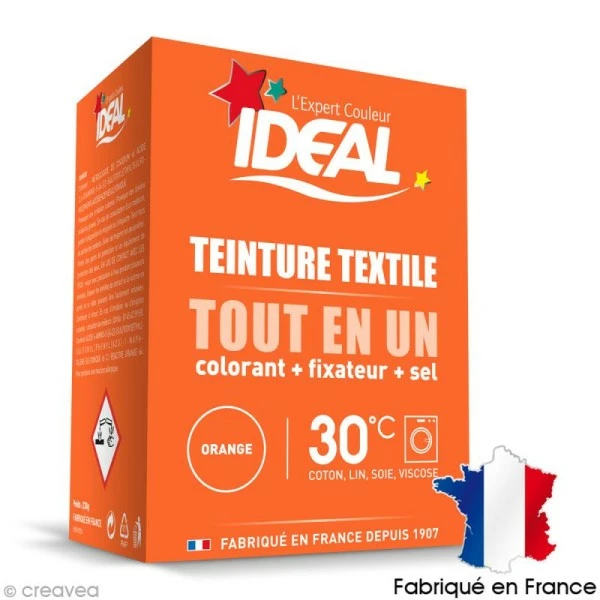 Ce kit teinture Ideal Tout en Un format Mini Orange contient tout le nécessaire pour teindre jusqu’à 600 grammes de textile. Il est adapté pour une teinture en machine à laver dès 30°C. En effet, vous trouverez dans cette boîte la poudre colorante Orange, le fixateur et le sel en un seul sachet. Plus besoin d’acheter ces éléments à part, tout est dans la boîte !