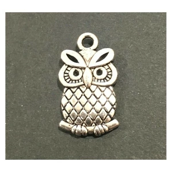 breloque en métal argenté, le hibou est visible sur les 2 face et fait 1,8cm sans la bélière