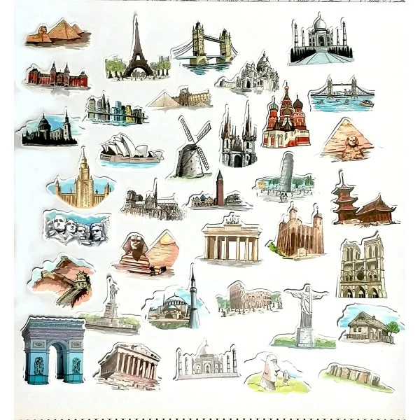 LOT DE 36 STICKERSles plus beaux monuments du monde. Superbes aquarelles des plus beaux monuments du monde , Pyramides d’Egypte, Colisé de Rome, Tour eiffel, Tour de Londres, de Pise, Taj Mahal..tailles de 25 à 70 mm