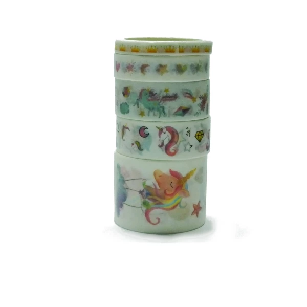 Rubans Washi largeur 0,5 , 1 , 1,5, et 3 cm , longueur 2 m . Motif licorne . Le Washi tape est une sorte de ruban adhésif décoratif utilisé pour décorer plusieurs types de surfaces différentes. Il peut masquer des défauts (d’où l’autre dénomination populaire Masking Tape) sur la couverture d’un cahier, à la surface d’un cadre photo ennuyeux ou d’un vase ordinaire.