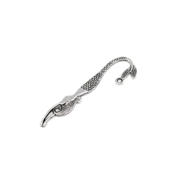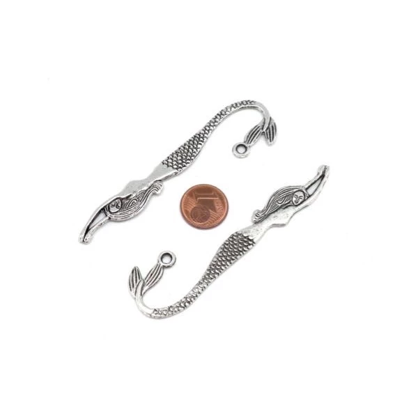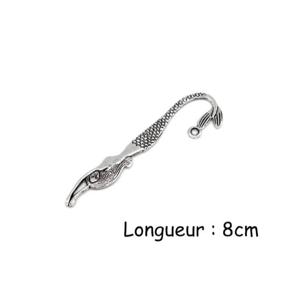 2 Marques pages sirène en métal travaillé argentéLongueur8,0cm +/- 0,5mmLargeur11,0cm +/- 0,3mmDiamètre du trou2,8mm +/- 0,2mmPrix indiqué pour 2 marques pages sirène argenté à customiser avec un anneau brisé et des breloques, pompons, petits pendentifs, plumes..Autre modèle disponible