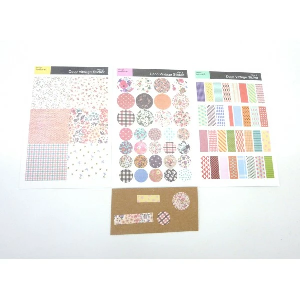 Données techniques pour 3 Planches D’étiquettes Adhésives, Stickers Embellissement Scrapbooking Motif Fleurs, Carreaux, Ra