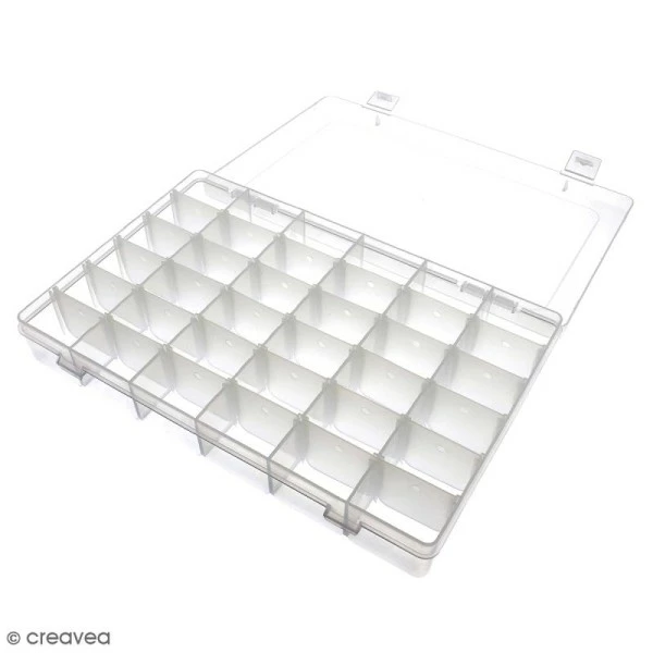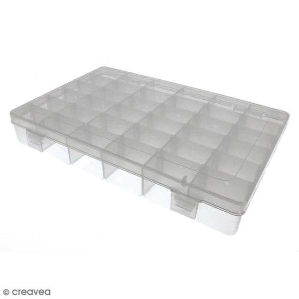 Cette boîte de rangement de dimension 27,5 x 18 x 4,5 cm contient 36 cases de 4,5 x 3 cm.