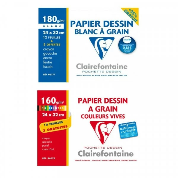 - 1 pochette de papier à dessin Clairefontaine blanc à grain – 24 x 32 cm – 180g/m ?. Idéal pour les activités artistiques. La particularité de ce papier repose sur son grain plus marqué sur une face, sa couleur naturelle et sa polyvalence (techniques sèches et humides). Son grain permet une bonne accroche des pigments et offre des possibilités de nuances de gris très riches. Selon le grammage, il convient aussi à la gouache. Le papier dessin Clairefontaine est la référence des listes de fournitures scolaires pour les travaux pratiques et les cours d’art plastique.