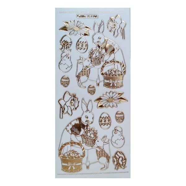 Description de 1 planche de stickers autocollants transparents embossage relief doré PAQUE LAPIN FLEUR OEUF 7106