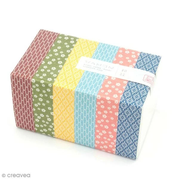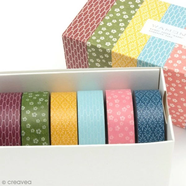 Adorable coffret de 6 masking tape MT wamon n°3. Il est issu de la collection fleurs de la marque et sera parfait pour tout décorer dans un style Liberty. Chaque rouleau fait une largeur de 1,5 cm pour une longueur de 7 mètres et représente des motifs floraux traditionnels japonais. Vous pouvez aussi les acheter à l’unité sur le site.