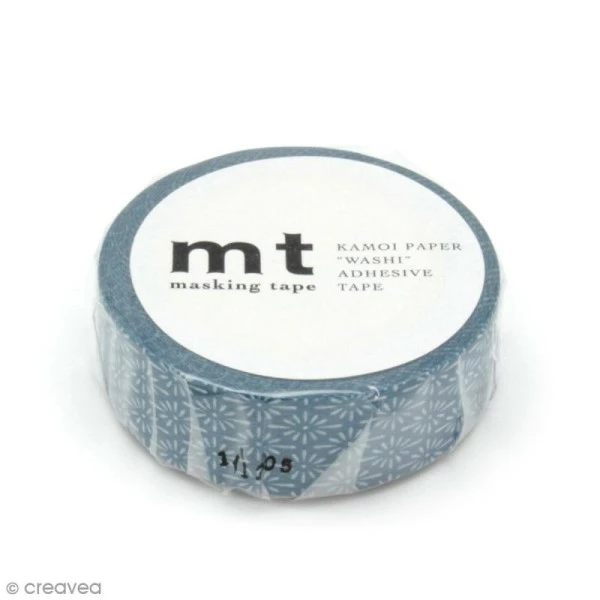 Rouleau de masking tape MT, thème Fleurs bleues. Il est issu de la collection fleurs de la marque et sera parfait pour tout décorer dans un style Liberty. Il fait une largeur de 1,5 cm pour une longueur de 7 mètres et représente des fleurs stylisées blanches sur fond bleu pétrole.