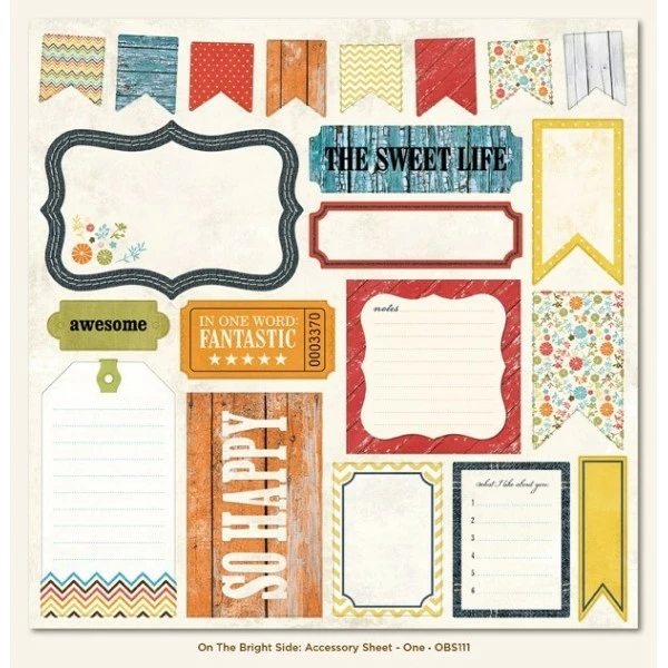 Feuille d’étiquettes MY MIND’S EYE one the bright side Feuille 30,5cm x 30,5cm d’étiquettes prédécoupées de chez My mind’s eye. Ces étiquettes pré-découpées mais pas autocollante vous serviront pour décorer vos pages de scrapbooking