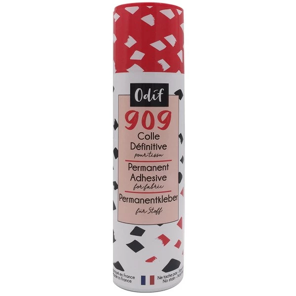 La colle définitive 909 permet de coller toutes sortes de tissus. Elle est à la fois transparente, sans acide et ne tâche pas. Cela en fait un accessoire idéal pour customiser en toute facilité ! Utilisez la colle 909 pour coller fortement et définitivement les tissus sur des supports papiers, cartons et bien d’autres choses en vaporisant sur les deux faces.