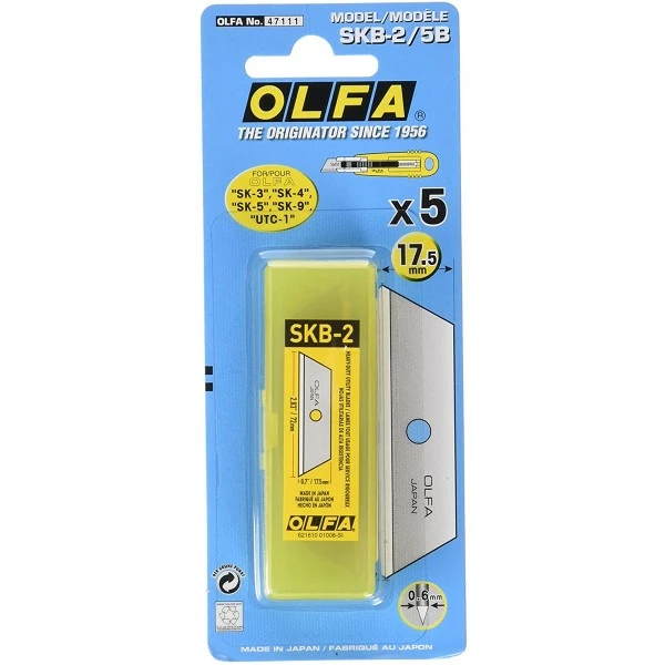 Ces 5 lames SKB-2/5B Olfa sont des lames de remplacement trapézoïdale de 17,5 mm pour cutter Olfa, SK-6, SK-4 et SK-9. Ces lames sont destinées à un usage polyvalent.