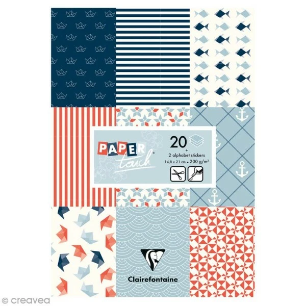 Bloc de 20 feuilles de papier scrap Clairefontaine, thème Marin, pour tout décorer ! Deux planches d’autocollants alphabets sont incluses. Ces jolis papiers imprimés recto et au format A5 (15 x 21 cm) seront parfaits pour la carterie, le scrapbooking, et la décoration de supports comme des boîtes par exemple. Le grammage est de 200 gr/m², et la qualité supérieure de ces feuilles de la collection Paper Touch vous permettra de les découper et de les coller très facilement.