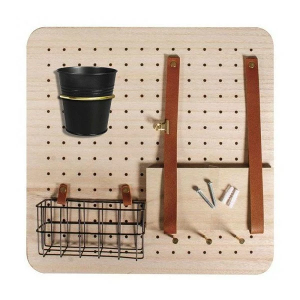 Kit Organiseur mural personnalisable avec panier et gobelet. Kit complet pour décorer votre mur avec un ensemble de décoration et d’organisation, pouvant être peint et décoré. Peut accueillir des fournitures, des accessoires de bureau et des articles de décoration d’intérieur. Organiseur de stockage Pin & Peg, dimensions 40 x 40 x 2,5 cm. Fixation en métal dorée. A utiliser avec le tableau mural personnalisable Pin & Peg ou sur une paroi à trous, par exemple dans un atelier. Pot-gobelet en métal, 10,5 cm ø – 11 cm, fond ø 7,5 cm – à utiliser seul ou avec le porte-gobelet métallique fixé à une paroi.