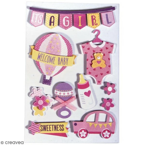 Planche contenant 10 autocollants 3D sur le thème Bébé fille.