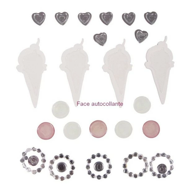 Composé de 9 cabochons en forme de coeur fuchsia 0,8 cm , 4 glaces de 4 cm , 3 cabochons rose pâle et 4 blanc de 1 cm , 5 strass entourés de plus petit strass de 1,5 cm.