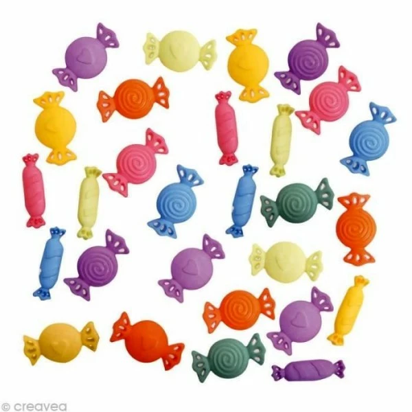 Assortiment de 28 boutons décoratifs et miniatures Récréatys Bonbons, en plastique pour customisation et décoration.