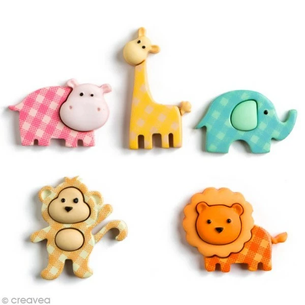 Assortiment de 5 boutons décoratifs Récréatys Jungle en plastique pour customisation, couture et décoration.