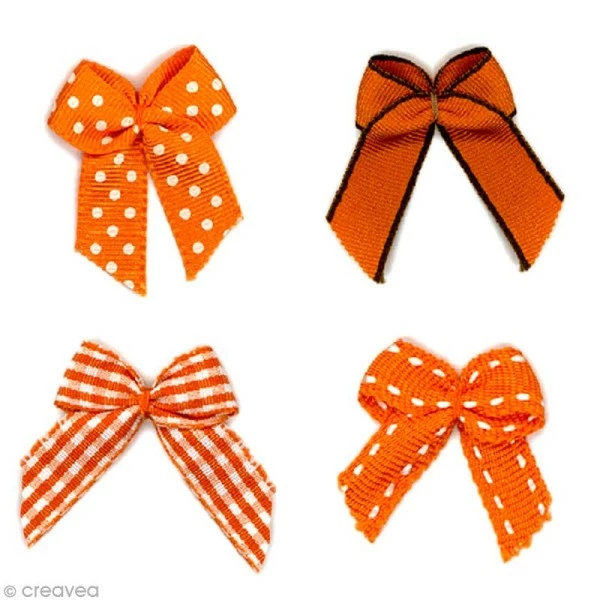 Assortiment de 10 noeuds en ruban oranges de la marque Recreatys. Ces jolis noeuds de 2,5 x 3 cm environ vous serviront pour la création de bijoux, la customisation, la couture et le scrapbooking. Cet assortiment Orange est composé de noeuds à lisière noire, à pois blancs, et vichys. Ils pourront parfaitement être cousus ou collés sur votre création.
