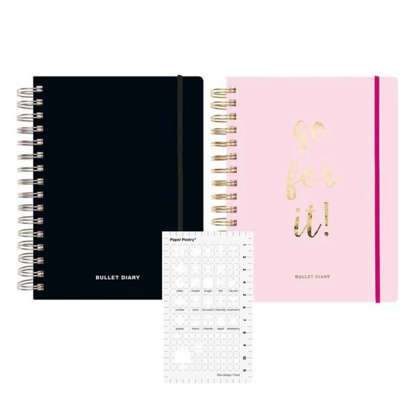 Description de 2 agendas Bullet journal rose et noir à spirales 96 feuilles + Pochoir food