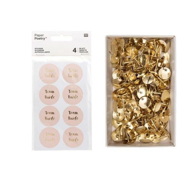 4 feuilles d’autocollants roses Team bride. Customisez à l’infini avec ces autocollants roses Team bride ! Petite boîte de 150 punaises dorées