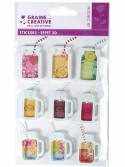 Graine Créative 9 Stickers 3D Boissons Mason Jars 5 Cm + 20 étiquettes Kraft Fanion