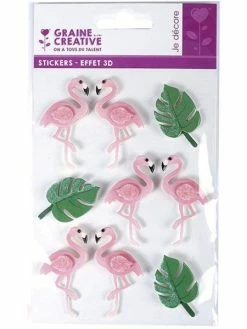 Graine Créative 9 Stickers 3D Flamants Rose 5,5 Cm + 20 étiquettes Kraft Fanion