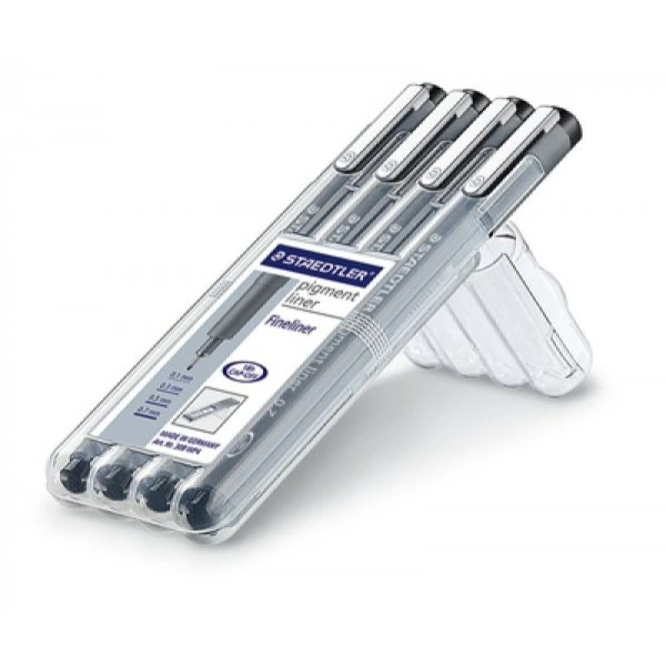 STAEDTLER feutre pigment liner, noir, étui de 4, longuepointe métallique idéale pour les régles et les gabarits,encre pigmentée, indélébile, résiste à la lumière et l’eau,effacable sur calque, avec clip métallique, contenu dans unétui-chevalet STAEDLER box breveté, contenu: 4 pièces avec4 largeurs de trait: 0,1 mm/0,3 mm/0,5 mm/0,7 mm (308 WP4)