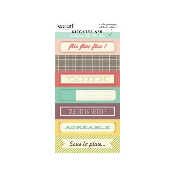 Stickers flic flac floc n°5 KESI’ARTCes 7 stickers flic flac floc n°5 KESI’ART seront parfait pour illustrer une carte sur le thème des saisons, du temps, mais aussi pour servir d’embellissements sur vos pages de scrapbooking en se collant sur vos papiers ou photos.Vous pourrez les utiliser comme autocollants décoratifs en les collant sur vos journaux intimes, carnet de notes, boite en bois,…