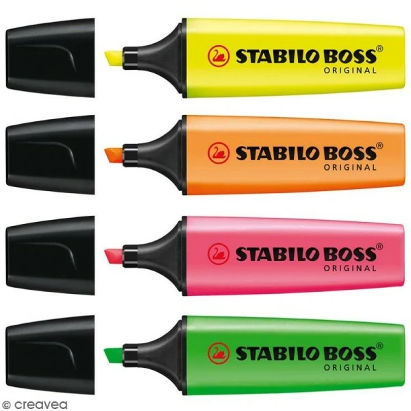 Ces surligneurs Stabilo Boss Original, de coloris assortis, sont des incontournables du bureau et votre trousse de travail. Avec leurs couleurs fluos éclatantes, ils vous permettront de mettre en lumiÚre, les informations écrites importantes avec leur pointe large.