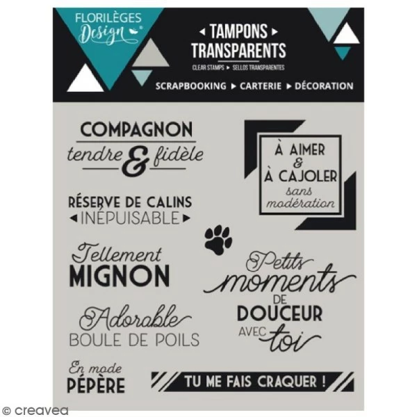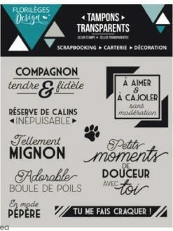 Set de tampons transparents Compagnon fidèle (Florilèges Design), parfaits pour embellir vos créations de carterie, faire-part, scrapbooking, décoration home déco ou tout autre idée créative. Ils mesurent De 1,2 x 1,2 cm (plus petite forme) à 4 x 4 cm (plus grande forme). Vous pourrez utiliser un tampon transparent de différentes manières. En effet, vous pourrez opter pour un encrage classique, réaliser une colorisation, utiliser de la poudre à embosser pour donner un maximum de relief, combiner vernis et poudre pailletée, etc. Pour utiliser un tampon clear Florilèges Compagnon fidèle, il vous faudra utiliser un bloc de positionnement. Grâce à la transparence du tampon et du bloc, vous pourrez placer précisément l’empreinte du tampon sur votre création.