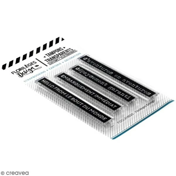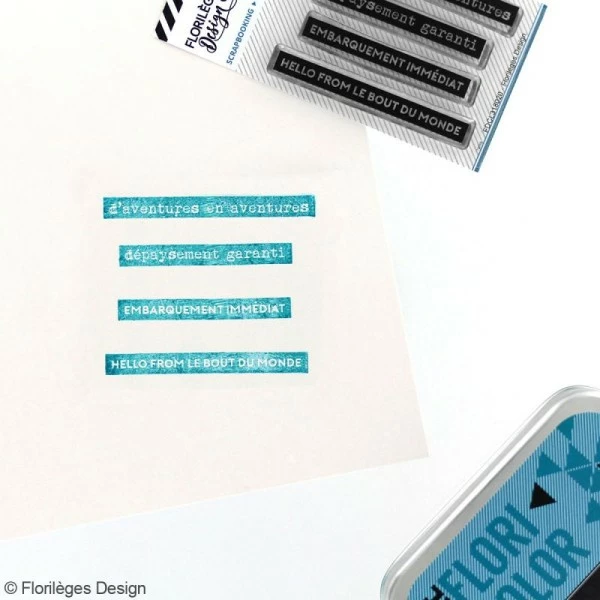 Planche de 5 x 7,5 cm contenant 4 tampons transparents Embarquement immédiat Florilèges Design de la collection Capsule de Septembre (Invitation au voyage) pour embellir vos créations de carterie, faire-part, scrapbooking, décoration home déco ou tout autre idée créative. Vous pourrez utiliser vos tampons clear Embarquement immédiat de différentes manières. En effet, vous pourrez opter pour un encrage classique, réaliser une colorisation, utiliser de la poudre à embosser pour donner un maximum de relief, combiner vernis et poudre pailletée, etc. Pour utiliser votre set de tampons clear Florilèges Embarquement immédiat, il vous faudra utiliser un bloc de positionnement. Grâce à la transparence du tampon et du bloc de positionnement, vous pourrez placer précisément l’empreinte du tampon sur votre création.