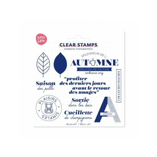 Tampons transparents KESI’ART Saison des pulls Grâce aux tampons transparents, vous voyez par transparence où vous positionnez votre motif ! Les bordures, alignements et reprises de motif sont ainsi facilités. Technique d’utilisation de votre planche de tampons transparents :- Placez le tampon sur un bloc de positionnement transparent (vendu séparément)- Appliquez le tampon monté sur le bloc contre le tampon encreur en appuyant légèrement- Réalisez votre empreinte de tampon sur votre créationConseil d’entretienNettoyez vos tampons avec un essuie-tout humide entre chaque couleur. Avant de ranger vos tampons, nettoyez-les à l’eau claire et au savon ou utilisez un nettoyant pour tampon. Thèmes scrapbookingL’automne, cueillette des champignons, les feuilles tombent