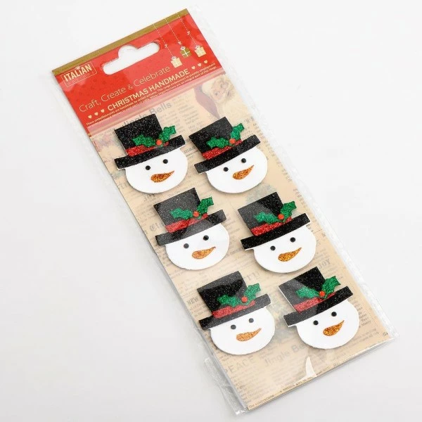 Planche de 6 jolie autocollants paillettes en forme de Bonhomme de Neige ThèmeHiver / Noël Dimensions3.5cm x 4cm Ces jolies embellissements, auto-adhésifs ont été créés avec une attention aux détails. Utilisez votre créativité et votre imagination pour ajouter une touche spécial à tous vos projets de fête ce Noël. Facile à utiliser pour faire ressortir vos cartes et créations de Noël.