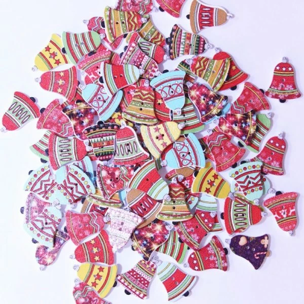 Description de Bouton de Noël en Bois – Forme Cloche Imprimé – Thème Noël – Lot de 10