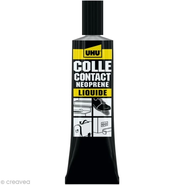 Colle contact néoprène UHU liquide pour tous vos travaux et bricolages. Cette colle extra-forte universelle est facile à appliquer. Le collage reste élastique après le séchageil absorbe les tensions entre les matériaux. Il est aussi rapide est pratiqueil est possible de travailler avec les matériaux assemblés, dès le collage réalisé. Résistante à l’eau, aux températures (-15°C à +70°C) à l’huile, aux acides dilués et aux solutions alcalines, la colle contact néoprène UHU colle le bois et tous ses dérivés, les plastiques, la céramique, la porcelaine, le verre, le métal, le cuir, le tissu, le feutre, le liège, le papier, etc. Cependant, elle ne convient pas pour le polystyrène expansé, les PVC souple, PE et PP.