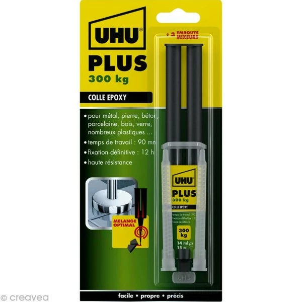 La colle epoxy UHU est idéale pour le métal, la pierre, le béton, la porcelaine, le bois, le verre et beaucoup de plastiques.