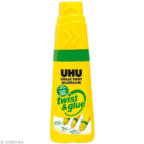 Flacon de colle liquide transparente Twist & Glue de UHU, sans solvant. Cette colle multi-matériaux permet une application simple et propre grâce à son embout de précision. Elle collera parfaitement la céramique, le bois, le métal, le verre, le plexiglas, et la plupart des plastiques (sauf PE/PP), etc.