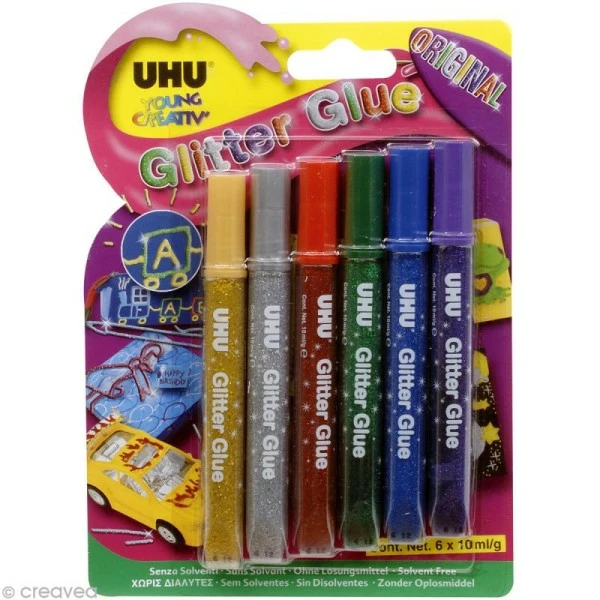 Assortiment de 6 tubes de colle à paillettes UHU, couleurs Original, pour décoration, scrapbooking et loisirs créatifs. Le tube souple et l’embout fin permettent des décorations faciles et propres sur une multitude de supports. Sans solvant et facilement lavable, la colle à paillettes UHU Original pourra servir pour les cartes de voeux, les cadres photos, la décoration de boîtes, etc, pour des effets pailletés ultra brillants.