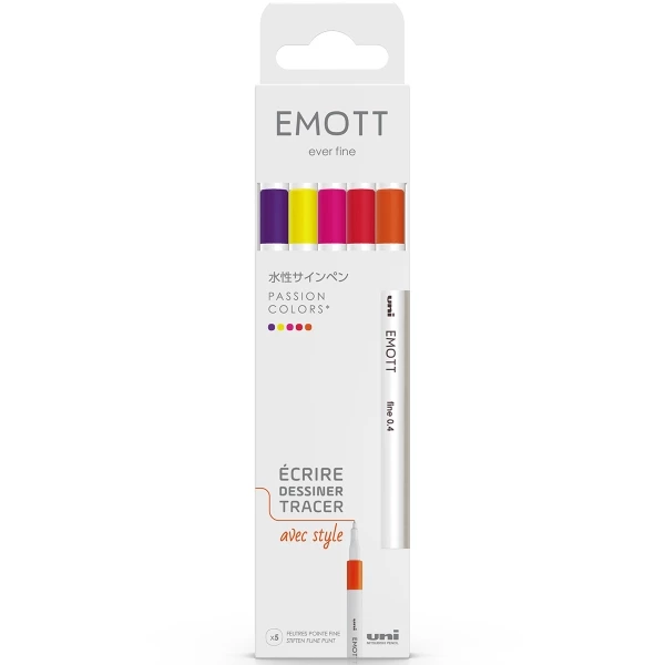 Description de Emott – Feutres d’écriture et de dessin pointe fine – Couleurs Passion – 5 pcs